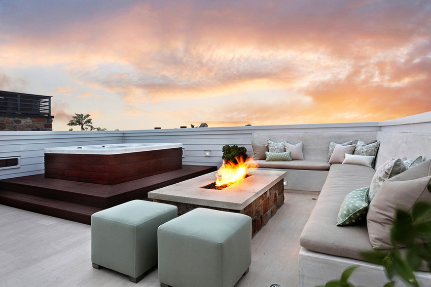A wonderful terrace will turn out if you enclose the roof plane with metal bumpers, place low containers with flowers or decorative cereals, and install light furniture. You can equip a barbecue area on the roof using fireproof materials to create it. Sometimes they install an inflatable or frame pool, a tennis court. Possible arrangement options can be seen on the photo of high-tech house projects with a flat roof.