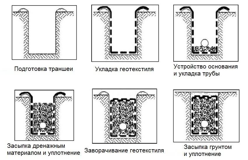 - It is necessary to close the drainage system with a geotextile with an overlap of 100 mm, and on difficult soils up to 500 mm.