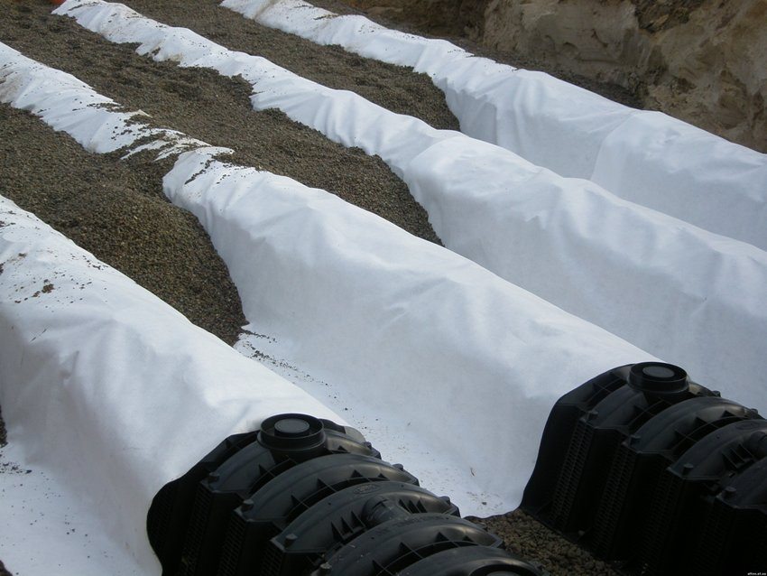 The use of a material such as geotextile in drainage systems can greatly save crushed stone. It will be less subject to soil clogging and retain its drainage qualities. Perforated pipes wrapped in linen will not clog. The soil will harden without harm to itself. All this is real with the right choice of web density.