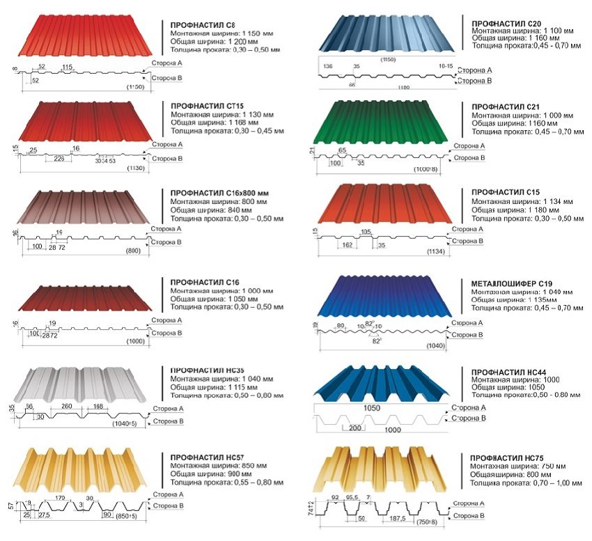 Profiled sheets differ in the height of the corrugation, the presence of a capillary groove and a variety of colors of the polymer coating. The corrugation shape of the corrugated board is trapezoidal and sinusoidal, less often a rounded and rectangular sheet is found.