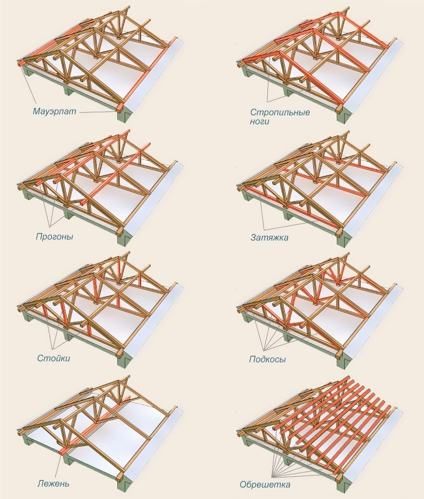 To build a gable roof of any of these types with your own hands, you need to know the details of its design and provide a connection diagram for each element.