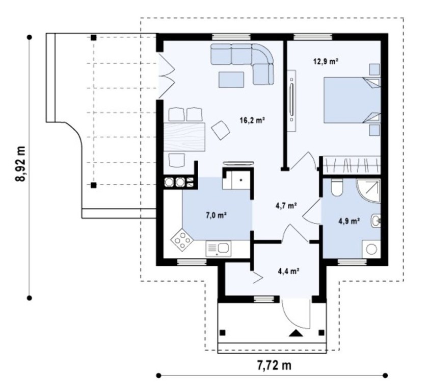 By choosing a project with a minimum number of architectural forms, you can increase the chances of fitting into a budget-constrained budget. To develop an optimal home layout, you need to use space wisely. 11 m² is enough for one person. By multiplying this indicator by the number of family members, and adding general-purpose rooms and sanitary facilities to the result, you can get an optimal house in all respects.