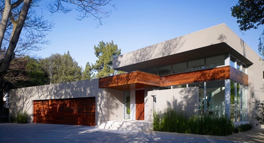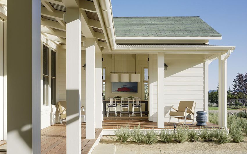 A canopy over the porch and the terrace is supported by metal supports