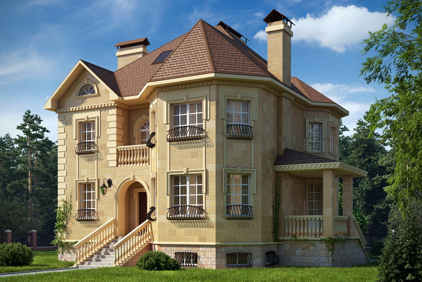 Modern projects of country houses and cottages may include other architectural additions, for example, a flat roof, plinth, terrace, veranda, large porch, balconies, basements, rotundas. The presence of a real fireplace is also reflected in the architecture, ventilation system and requires a special layout.