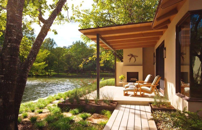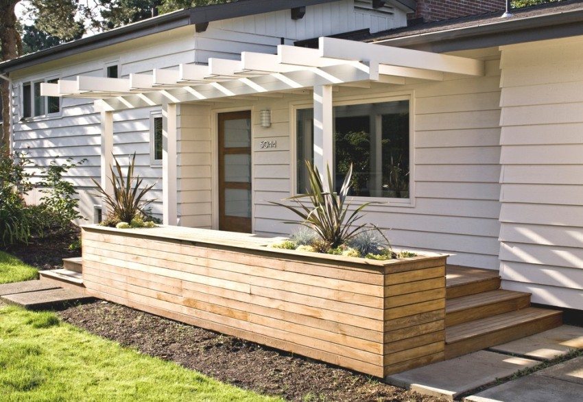 Any awnings can be divided into two types: suspended and supporting. In the first version, the entire weight of the structure is held by the wall to which the frame is attached. Therefore suspended marquises and awnings are best mounted from lightweight materials. Support options are more practical. Thanks to the additional support in the form of support pillars, you can save on space by turning the canopy over the porch into a real terrace. Railings or fences are additionally installed to such structures for more serious protection from bad weather.