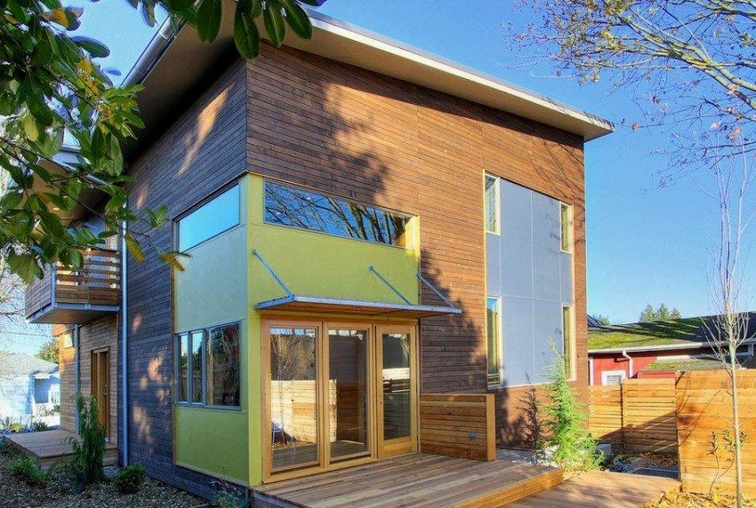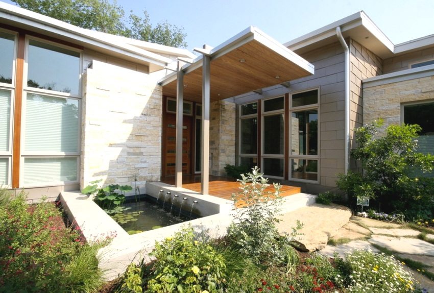 The canopy made of polycarbonate looks great over the porch of a private house. Photos of the various options presented below demonstrate the uniqueness of the style solutions. Such sheds do not require special conditions, they perfectly withstand both the hottest days and severe subzero temperatures. Due to the lightness of the covering material, they can be freely attached to the wall of the house without additional supports.