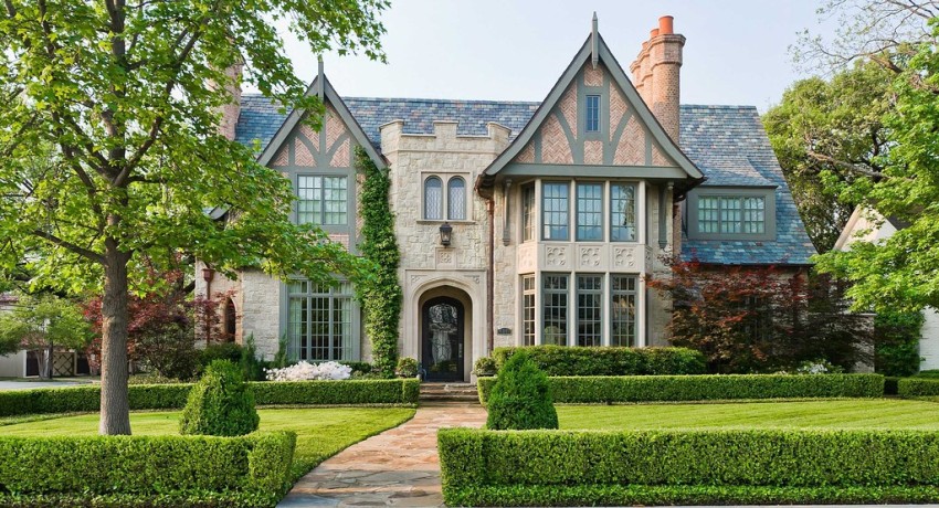 House in the English style. Features of architecture of different eras. Modern classic style. One-storey houses, cottages. Facade decoration. English landscape design.