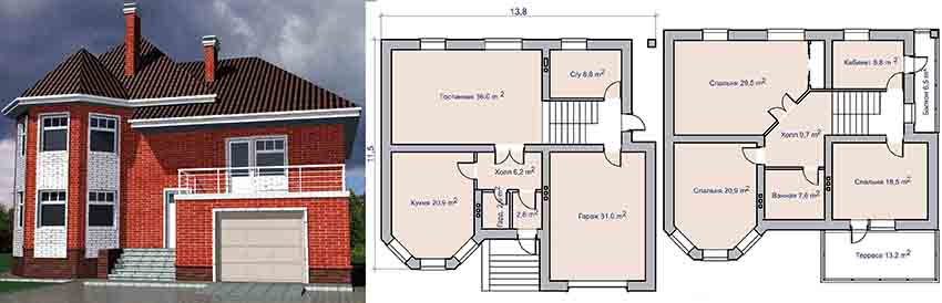 Photos of projects of brick houses allow you to appreciate the advantages of two-story structures. The ground floor also includes facilities such as a guest bedroom and utility room. Features of the layout of such buildings allow you to create a unique, spacious home. When drawing up a project, one should not forget about building codes and requirements. The second floor can accommodate three bedrooms, for example, two for children and one for a guest room, as well as a bathroom. As a rule, such buildings are designed together with a terrace.