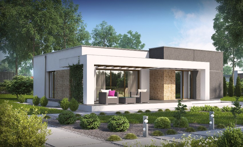 In the photo, projects of one-story houses with a terrace look attractive. They combine modern trends in the development of architecture and the best design ideas. Moreover, such buildings comply with all safety standards and regulations.