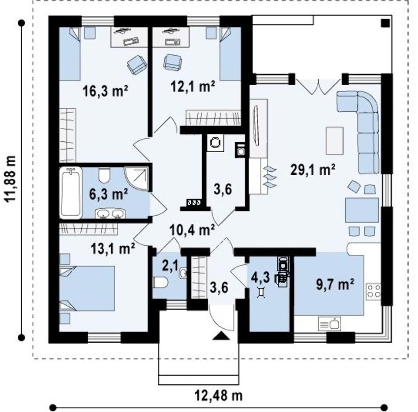 When a terrace is provided in the project, it can replace the dining room in the summer, or a recreation area can be located here.