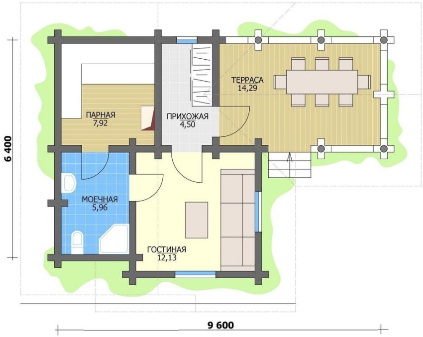 If the construction budget and the size of the site allow, you can consider projects of baths, which have a relaxation room and a terrace. Such structures are more practical and versatile. In the projects of baths with a relaxation room and a terrace, the entrance area can be covered and placed under the same roof with the main building. In this case, the emphasis of the rafter system is transferred to the racks, which are an integral part of the frame. Fencing structures are attached to the same elements.
