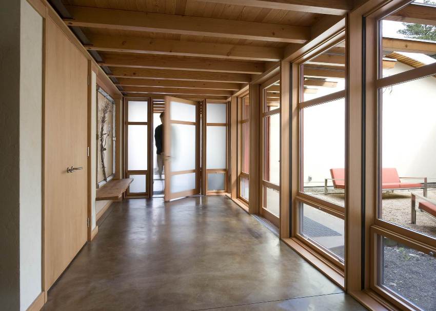 Often, users find photos of one-story houses with a terrace located on the west side. Such designs are suitable for people who will be using the entrance area in the afternoon. Even if the terrace has a closed structure, protecting the space from westerly winds, at sunset the sun's rays will still penetrate into this area, providing a comfortable environment for relaxation.