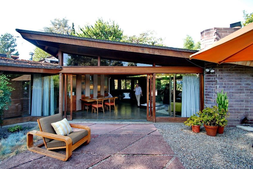 On the network, you can find many colorful and unusual design solutions in the photo; the terrace to the house is most often attached from the side of the kitchen or living room. This type of accommodation is primarily driven by considerations of convenience, comfort and practicality. In 90% of cases, the terrace is located on the opposite side of the main entrance. This design solution is a traditional design option for one-story buildings located in the southern regions.