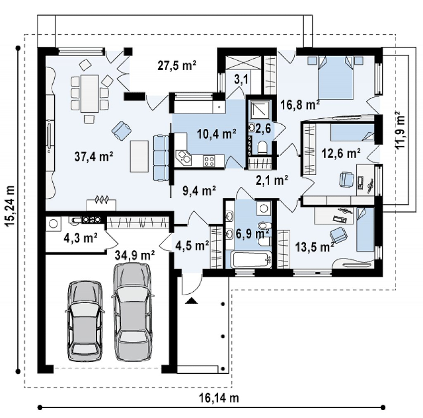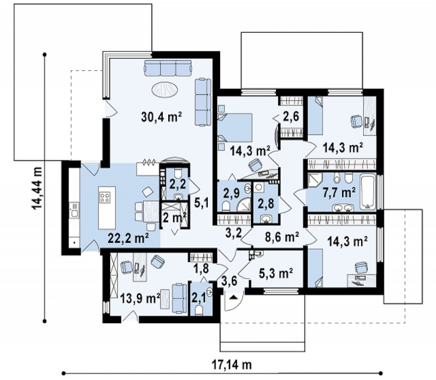 One-storey buildings are designed for comfortable living of a family of 3-6 people. The 3-bedroom layout is ideal for both parents and kids under the same roof. In this case, one rest room will belong to the parents, and the other two can be used as children's or guest rooms. Such buildings are suitable for people with disabilities or old people.