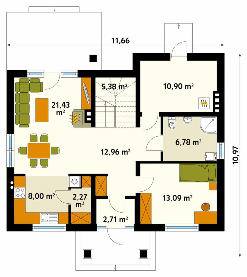 The most suitable solution for the use of the second floor is the arrangement of bedrooms and a bathroom on it. The layout of the first tier involves the placement of a living room, kitchen, bathroom and storage rooms.