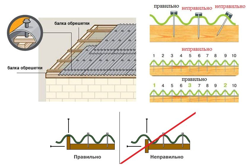 - After the initial row is securely nailed, you can start laying the second one. Particular attention should be paid to nailing the overlap. The sheets in these places should not have any backlash. All subsequent rows are laid similarly. ondulina... When moving on the sheets with your feet, you need to step only in places where there are crate boards and only in soft shoes, and better barefoot, if the weather permits.