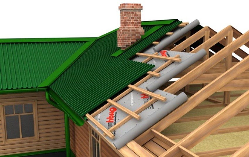 If the angle of inclination of the planes of the roof slopes increases to a range of 10 - 15 degrees, then the crate can be made not solid. An interval of 45 cm is taken along the axes. That is, this is the distance between the upper edges of two adjacent boards. The overlap at the ends is 200 mm, and at the sides in 1 wave. Angles of inclination greater than 15 degrees allow the use of battens with an axial spacing of 60 cm, an overlap at the ends of 170 mm and on the side in 1 wave.