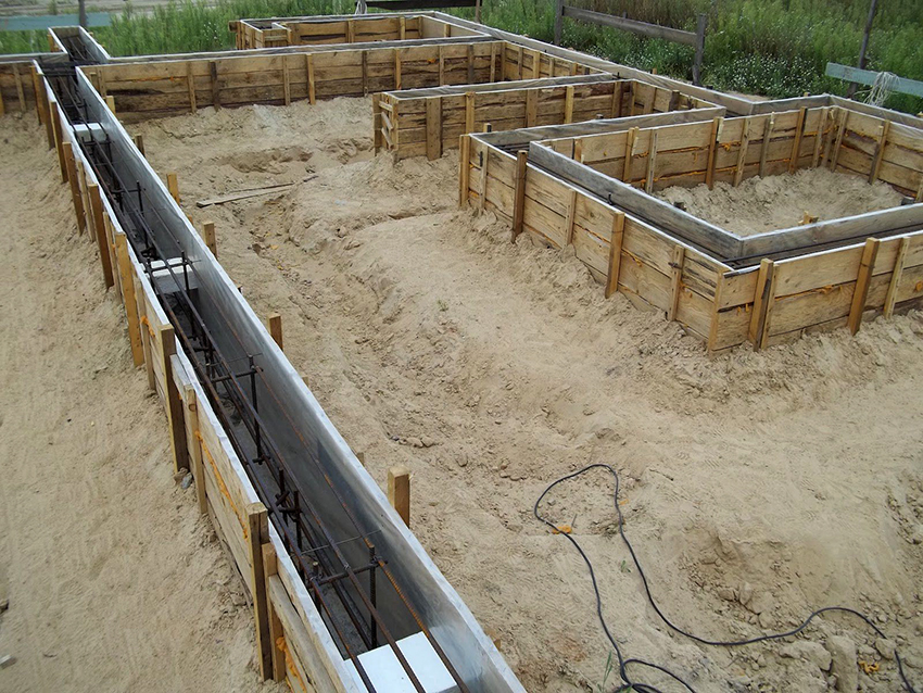 The walls of the trench are equipped with formwork, which is lined with roofing material or dense polyethylene. Next, a reinforced belt is prepared from scraps of reinforcement and thick metal rods tied with a metal wire.