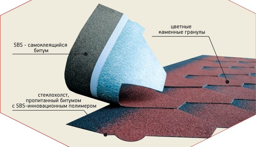 In addition to bitumen, the composition of the soft roofing material is largely present glass canvas... This gives the tile high tensile and tensile strength, non-combustibility and resistance to deformation under the influence of high temperatures. Roofing technology allows you to use it for re-roofing over old soft material.