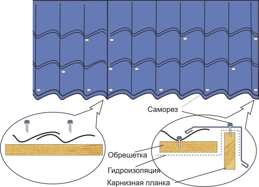 Then another 2 - 3 sheets are laid, observing the features of their relief. They are not attached to the crate, but only fastened together. Then the entire structure of several sheets is aligned parallel to the cornice and finally fixed with self-tapping screws. Subsequent sheets are stacked without any problems. Align only their bottom edges relative to each other.