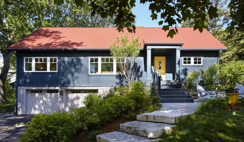 The canopy with a metal roofing is in perfect harmony with the roof of the house, so it is important to choose the material in color. It is beneficial to equip such a porch canopy after the completion of roofing work. In this case, it can be literally collected from scraps.