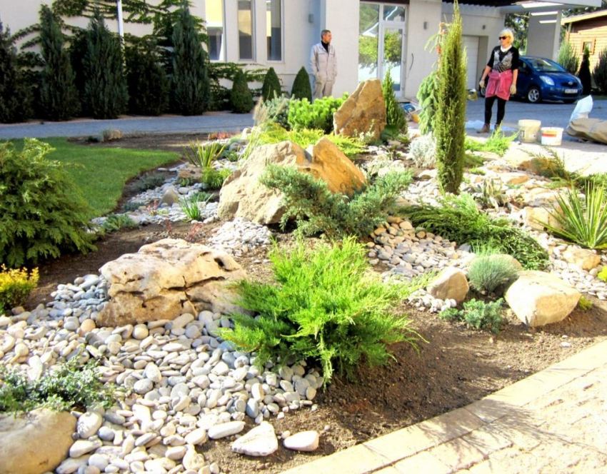 When creating a rock garden from a massive stone, try to seek help from family and friends. It is quite difficult for one to master such a structure with his own hands. A photo of alpine slides with stones demonstrates the scale of these compositions.