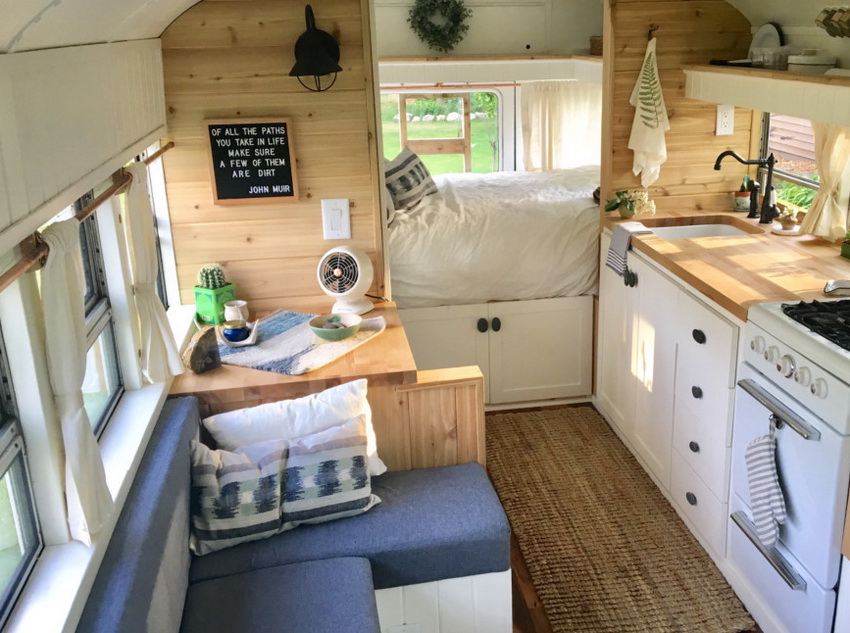 The most expensive option in terms of buying or building is bus-based housing. This transport has large dimensions, allowing you to thoroughly approach the issue of arranging a comfortable space. The bus initially has a heating and insulation system, so it is much easier to work with it. The stages of construction are carried out in the same order, and the interior layout is selected taking into account personal preferences and needs.