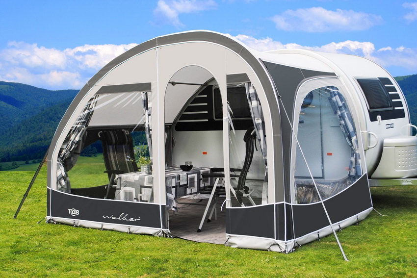 Tent structures are a combination of a trailer and a tent that is attached to it. Most often, the dining area is located in the center, and two bedrooms are located on either side of it. The spacious tent is attached to the body of the van. Sometimes it is equipped with a canopy that allows you to spend time outdoors.