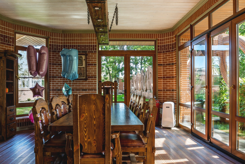 With the help of such windows, you can protect the interior, and if not necessary, they can be completely raised and the building can be transformed into an open gazebo. For example, on warm summer days, it is more relevant to leave the room open, and in the event of bad weather, it will be possible to quickly transfer the gazebo to the so-called "protected mode".