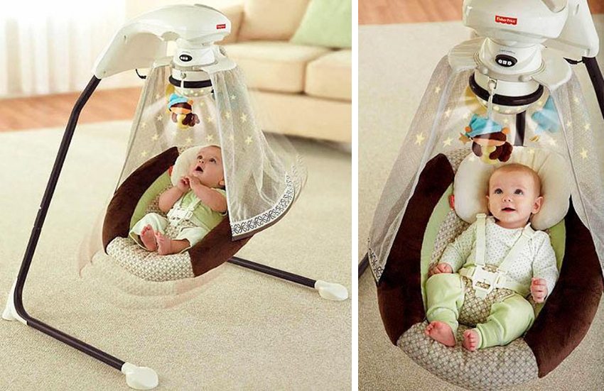 The electronic product will rock the child on its own while the parents are busy with household chores. The structures are equipped with a rechargeable battery and operate silently. Some models have software with training, music or fairy tales. Due to its small size, parents can take the swing when going to visit or to the country.