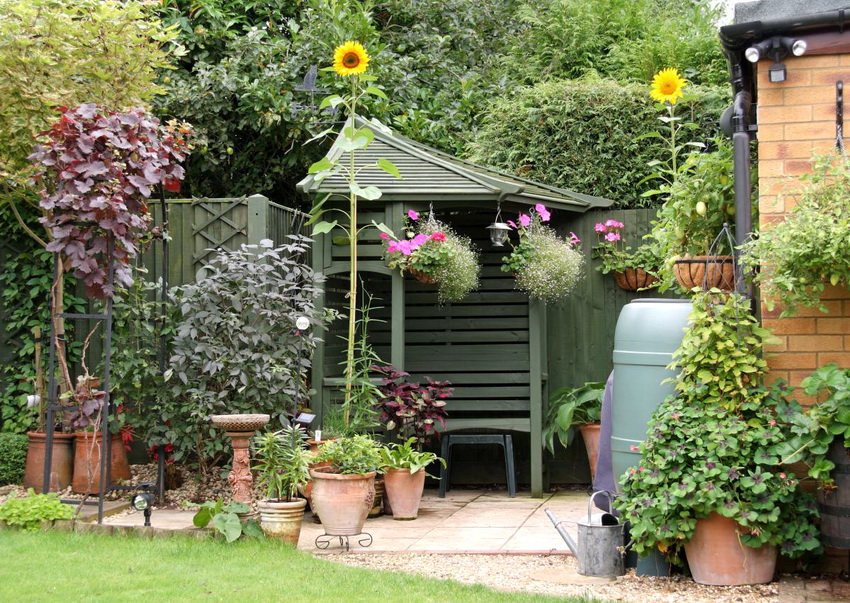 - attention to detail: an interestingly designed place for storing garden tools, irrigation pipes covered with greenery or buried in the ground, protruding difference in shape and color of hanging pots, hidden through decoration, etc.;
