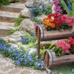The photo shows a beautiful do-it-yourself garden in the country, equipped with horizontally installed containers.