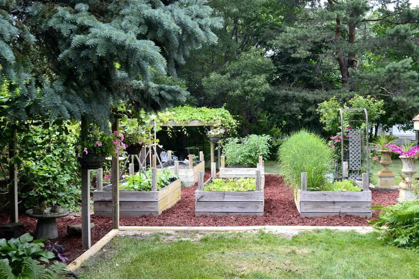 The vegetable garden involves the cultivation of berries, vegetables, green crops. This zone can also be made an excellent addition to the design of a summer cottage. A traditional-format vegetable garden located on a designated plot of land can be conveniently divided into rectangular sectors, delimiting them with concrete paths, deepened into the soil by 20–30 cm. Small stones can be placed in the still liquid top layer of concrete. Such a fence will not only add decorative effect, but also allow you to retain moisture during irrigation in each sector.