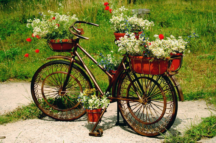 You can use an old metal bed to create an interesting country decor by tightly placing pots and containers with plants on it, among which there must be those falling down. They will imitate a bedspread. An interesting raised flower bed will turn out. The headboards should also be decorated using climbing plants or various objects: bells, balls, garlands of small wooden forms, bugles.