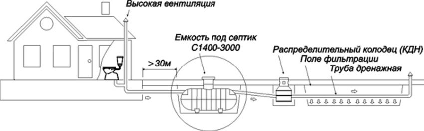 The second version of septic tanks provides for the organization of the separation of effluents into components of different density. In this case, the harder waste accumulates in the tank, while the liquid waste simply goes into the ground after settling. Water after such preliminary treatment is not suitable even for technical use as irrigation for plants. At the same time, it is safe enough for the soil, passing through which it is filtered until it enters the aquifers.