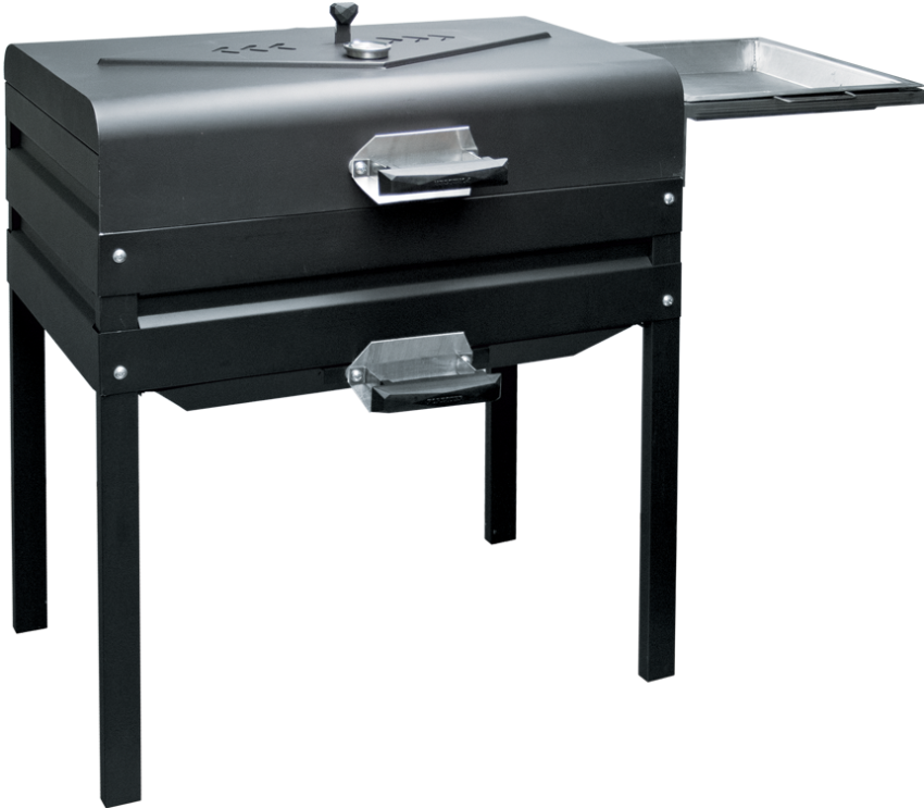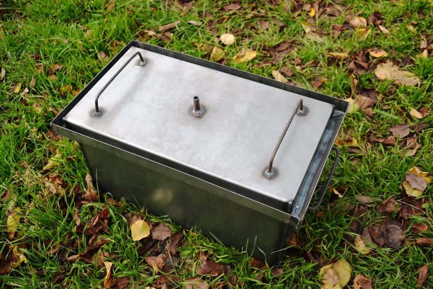 The smokehouse device with a water seal consists of a metal box and a sealed lid equipped with easy-to-grip handles