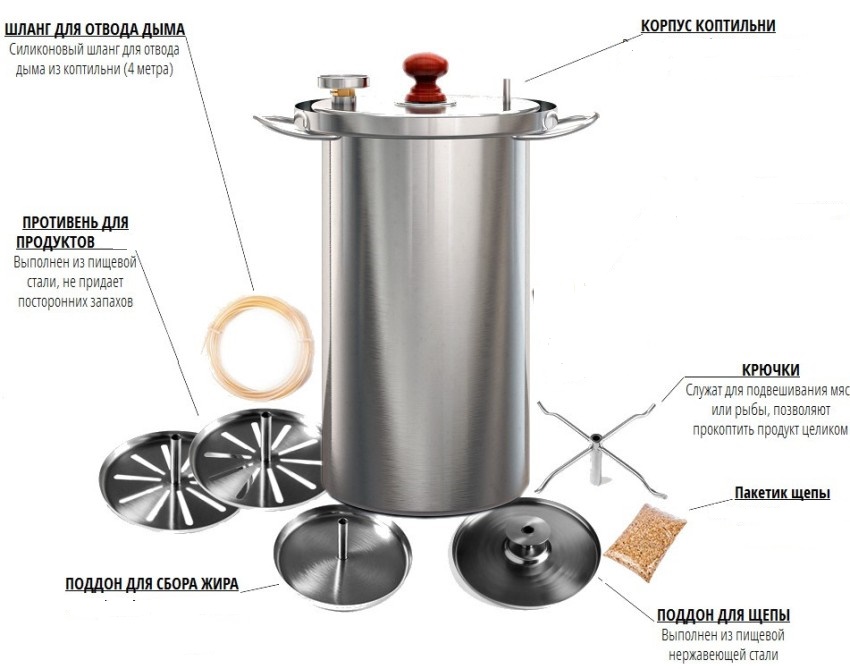 Lattice (one or more). This part is necessary to keep the smoked products at the desired height. Some devices may have other elements instead of grilles - holders with hooks. For cold and hot smoked smokers, this detail is mandatory.