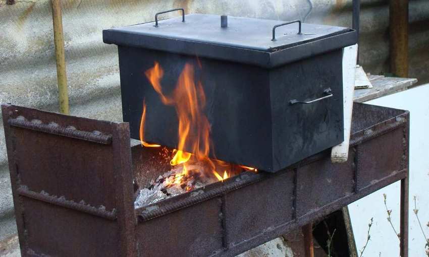 The materials from which these structures are assembled are inexpensive. Therefore, a hot smokehouse can be called a profitable device from a financial point of view. If necessary, you can make a portable device that will have a compact size. Such a smokehouse is suitable for hiking and country trips. Due to its small size, it can be easily transported in the trunk of a car.