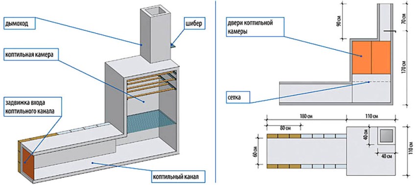 For example, on the Internet there may not be a drawing suitable for some non-standard slab options. And also the scheme will be needed in the case of making a smokehouse from improvised means. A drawing of a hot-smoked smokehouse with your own hands should include the following details and their detailed description: