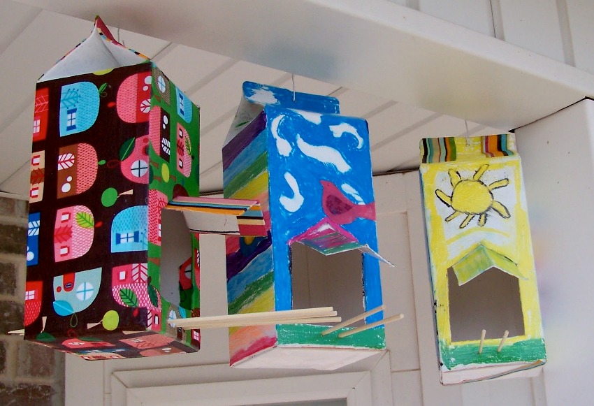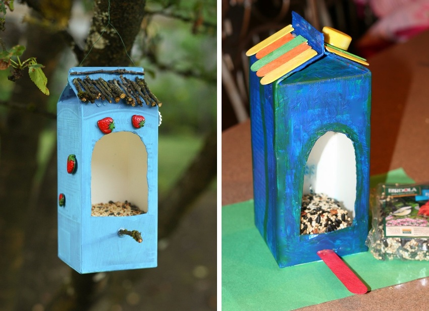 On the net you can find many interesting ideas for decorating homemade feeders. If you approach this issue thoroughly, you can make a house of an unusual shape. After that, the paint remaining after the repair, various figures and colored paper are used for decoration.However, do not overdo it with rustling and shiny details, otherwise the birds will be frightened. In addition, decorative elements should not create obstacles for the intake of feed.
