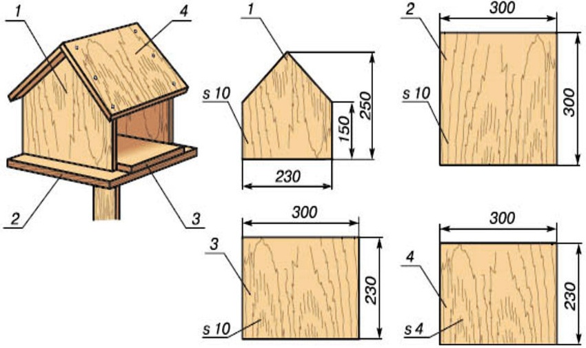 Wood or very dense pre-processed cardboard can be used as material for manufacturing. The design for large birds should be much larger than for ordinary birdies. In this case, you need to select for the birds drawings of a feeder with dimensions that will correspond to them.