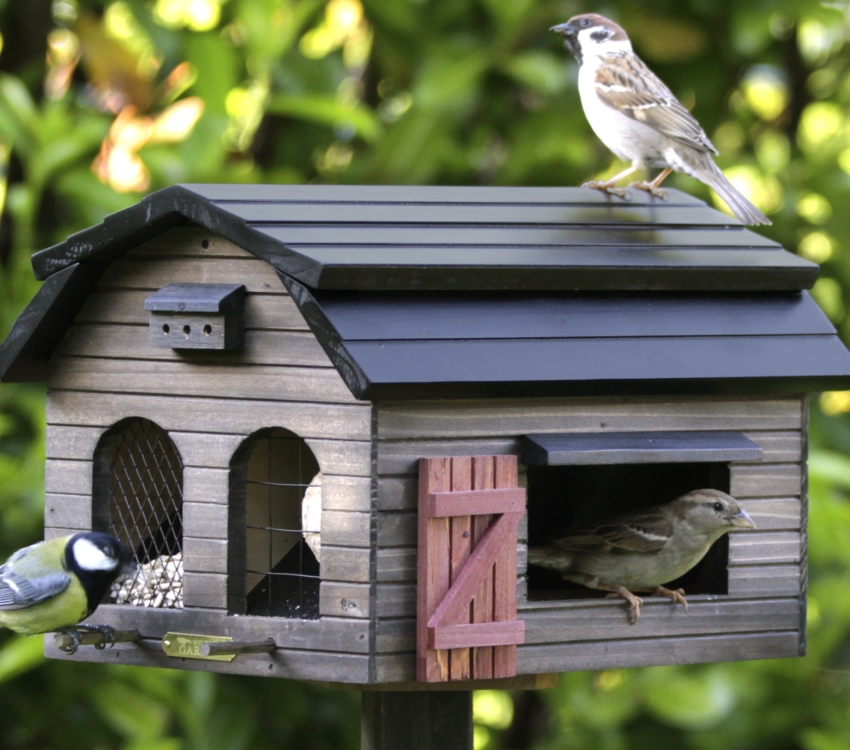 Sparrows are very careful. In case of danger, they fly straight up from the spot. Therefore, the best option would be birdhouse made of cardboard or wood with a steep roof with more overhangs. It is desirable that the structure has low windows that provide birds with access to food. In this case, the sparrows will first have to flutter to the side before flying away, so such feeders are unattractive for them.