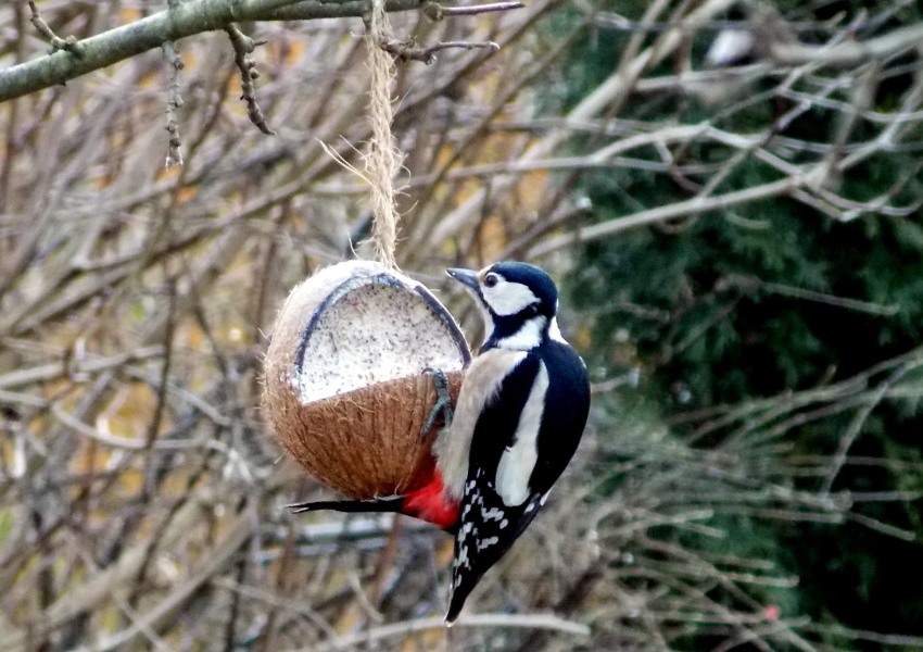 Hanging bird feeders can be made for certain types of birds. Great tits prefer garlands made from dried berries. They especially like rose hips. The use of peanuts in pods is allowed.