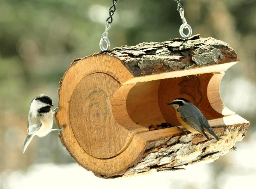 An interesting design will turn out if you arrange a wooden structure in the form of a bee hive or a miniature mill. This work is very meticulous, but if you try, you can achieve a complete resemblance to real buildings. The decoration in the form of small twigs will give the structure a natural charm. At the entrance you can hang a beautiful pine cone or an edible garland, the main thing is that it does not block access to the food.