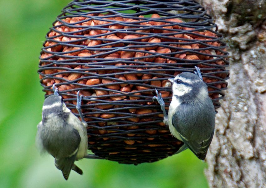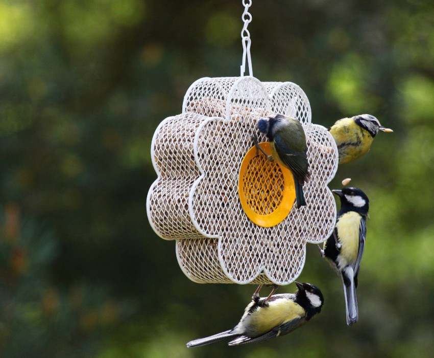 Swing feeders will be the best option for blue tit. In this case, it is advisable to hang the balls on elastic and thin branches so that they balance.