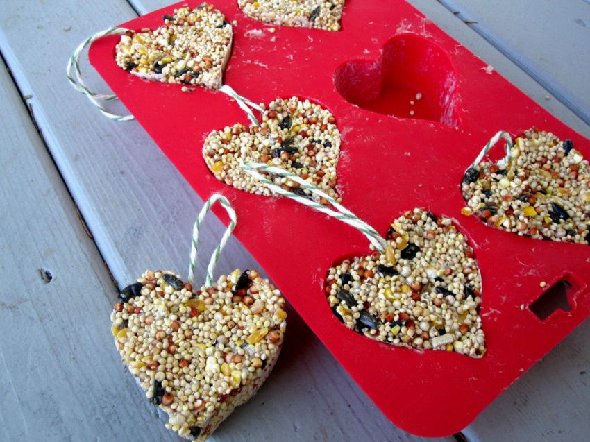 After that, the grain trough should be placed in the refrigerator for several hours. When the mixture hardens, the products can be hung on tree branches in the yard.