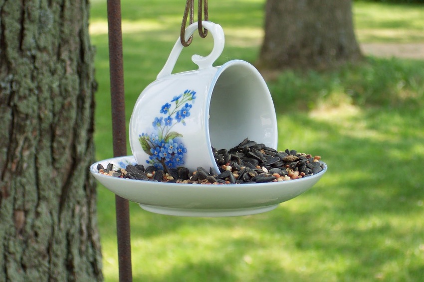 For decoration, you can use old utensils, for example, a saucer with a cup or a tea pot. To do this, 4 holes are drilled in the saucer and a rope is pulled through them. After that, the cup is glued to the saucer. Such a structure can be hung anywhere in the yard. The carving, bright painting, leather pieces and appliques look original in the design of the feeders. By creating several designs in the same style, you can get a beautiful composition that will emphasize the exterior of the yard.