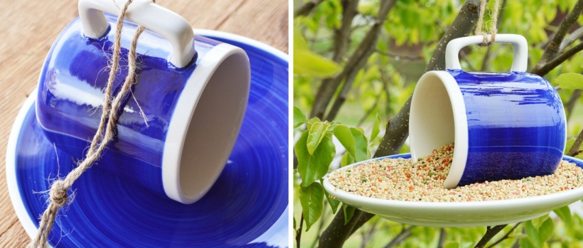 To make a feeder from a coffee service, you need to glue the cup to the saucer and fix the structure to the handle