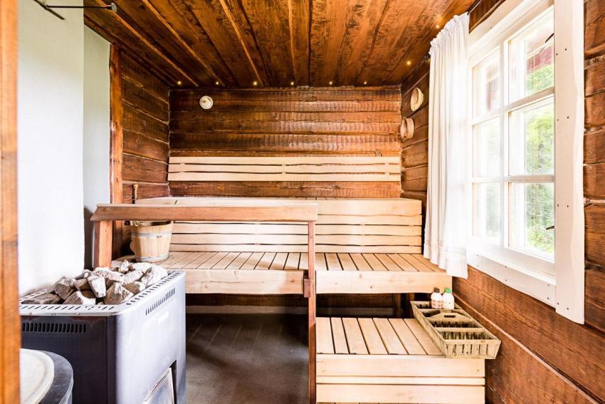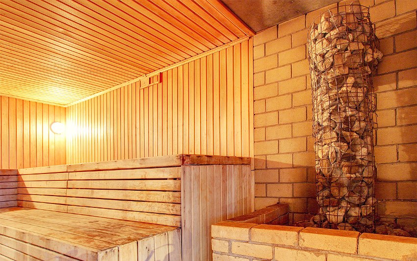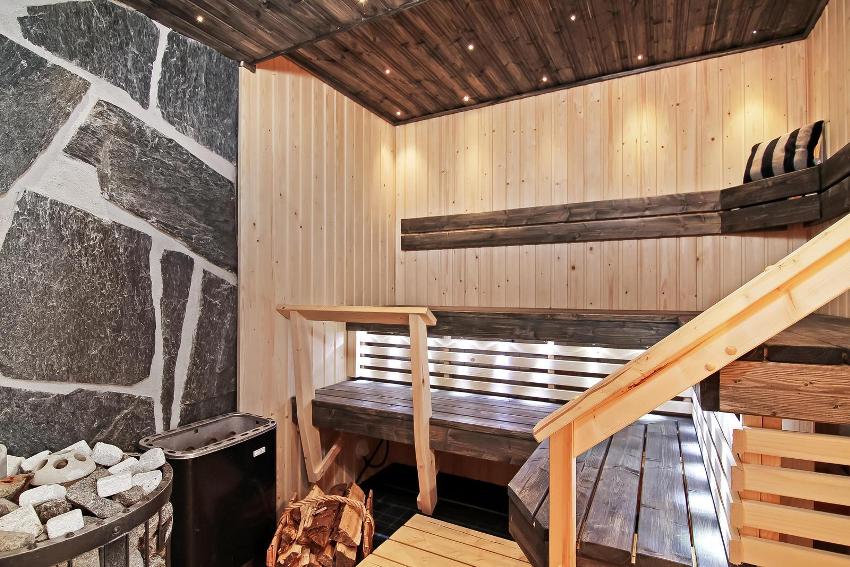 It is necessary to understand that the maximum temperature is kept under the ceiling, which is why it is necessary to choose lining for this surface from rocks in which there is a small amount of resins, otherwise their drops can burn the skin when falling. The finishing of the place where the stove will stand must be made of non-combustible materials - tiles, bricks.