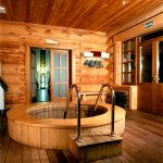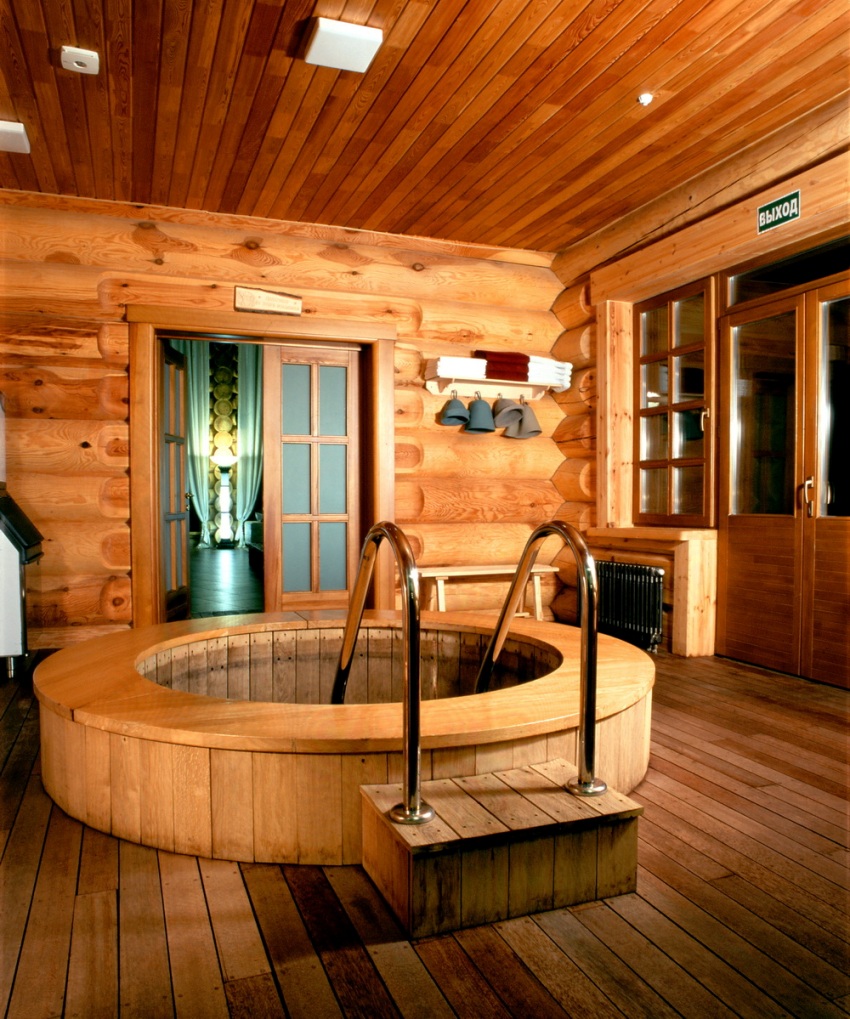 Traditionally, in a modern bath, the interior decoration, the photo of which you liked, is started from the floor. For a steam room, it is more expedient to raise it a little. It is desirable to do this in order to protect the room from unnecessary drafts, providing better heat conservation. The flooring is done with tiles, although edged and grooved boards are quite suitable.